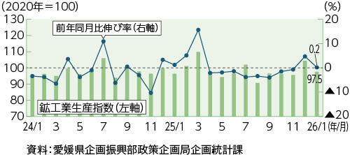 愛媛県の鉱工業生産指数(季節調整済指数)と前年比伸び率(原指数)の推移