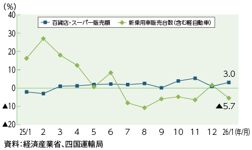 県内百貨店・スーパーの販売額と新車乗用車販売台数の推移(前年同月比)
