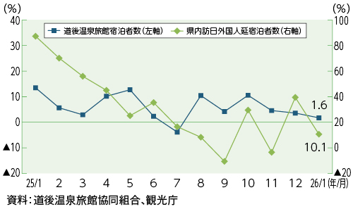 道後温泉旅館宿泊客数と県内訪日外国人延べ宿泊客数の推移(前年同月比)