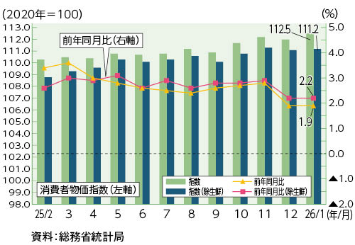 総合指数(前年同月比+1.9%)、生鮮食品を除く指数(同+2.2%)ともに上昇