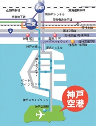 自動車を利用する場合でも、三宮から20分程度である。阪神高速神戸線などの自動車道とも接続しており、阪神地区や姫路市など兵庫県西部、淡路島、四国からの利便性が高い。